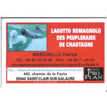 ELEVAGE DES PEUPLERAIES DE CHAUTAGNE CHIEN- TRUFFIER LAGOTTO ROMAGNOLO éleveur et dresseur canin depuis plus de 35 ans .j 'ai pratiqué le ring (en 3 pour les connaisseurs) , le rci et quasiment toutes les disciplines de sport canin, également "homme d'attaque" pour les initiés . j'ai crée ma lignée de travail dans le beauceron et le berger belge malinois . me téléphoner pour mieux connaitre mon cv cynophile ( en toute humilité) savoisien d'origine , j'ai déménagé en drome- Ardèche puis en isère . la drome est 1ere producteur de truffes , j'ai cherché un chien spécialisé et j'ai découvert le lagotto romagnolo j'ai omis, je suis cuisinier, charcutier-traiteur et grâce au lagotto je me suis spécialisé dans des produits truffés j'élève et je dresse cette race depuis 15 ans pas plusieurs races comme des sois-disants éleveurs élevage en famille avec enfants, chats autres chiens etc... donc les chiots sociabilisés et débourrés à la truffe avec de la vraie truffe pas de produits ou artifice de substitution . les chiots sont vermifugés, tatoués tous nos reproducteurs ont subits les dépistages: radio des hanches, adn, epilepsie juvénile et lsd je suis diplômé de l'école nationale du chien (BEPA option élevage canin) , pas un attestation de capacité canine passée en quelques jours!!! merci la société centrale canine de fabriquer des marchands de chien!!! ma compagne est également diplômée de l'école nationale du chien de saint-gervais d'auvergne en qualité de toiletteuse et pourra vous conseiller le lagotto est un chien qui ne perd pas ses poils mais à besoin d'entretien chez nous : de vrais conseils pour l'éducation de tous les jours de vrais conseils pour la recherche de la truffe . aide à la confirmation un vrai service après-vente vous pouvez visiter notre élevage ( recommandé ) nous avons tout à montrer et rien à cacher . goûter également les produits truffés maison ( sans colorants ni conservateurs le futur maître partira avec facture, documents véto et administratifs et un peu de truffe!! pour l'entrainement n'hésitez pas à nous téléphoner pour de plus amples renseignements tel: 068871842 laisser un message si absent photos de reproducteurs sur demande